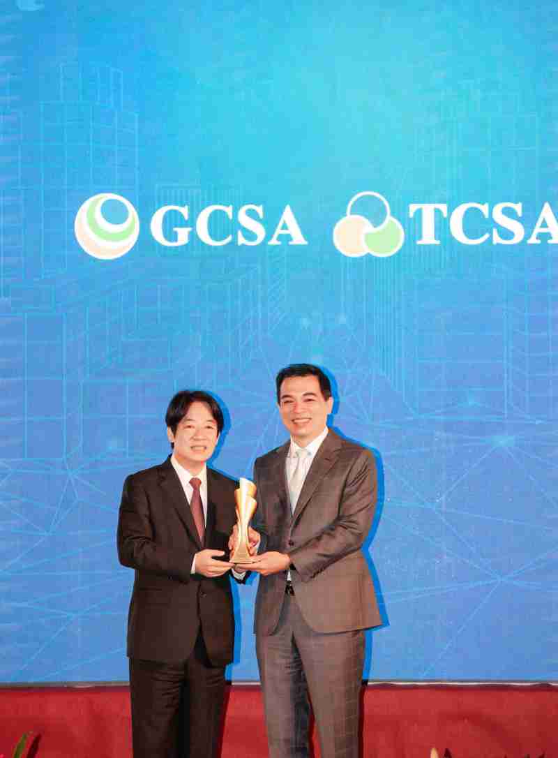 达全方位永续表现获全球永续奖及台湾永续奖肯定,,,,由副总统赖清德颁奖 (左),,z6尊龙总经理柯富仁 (右) 代表领奖