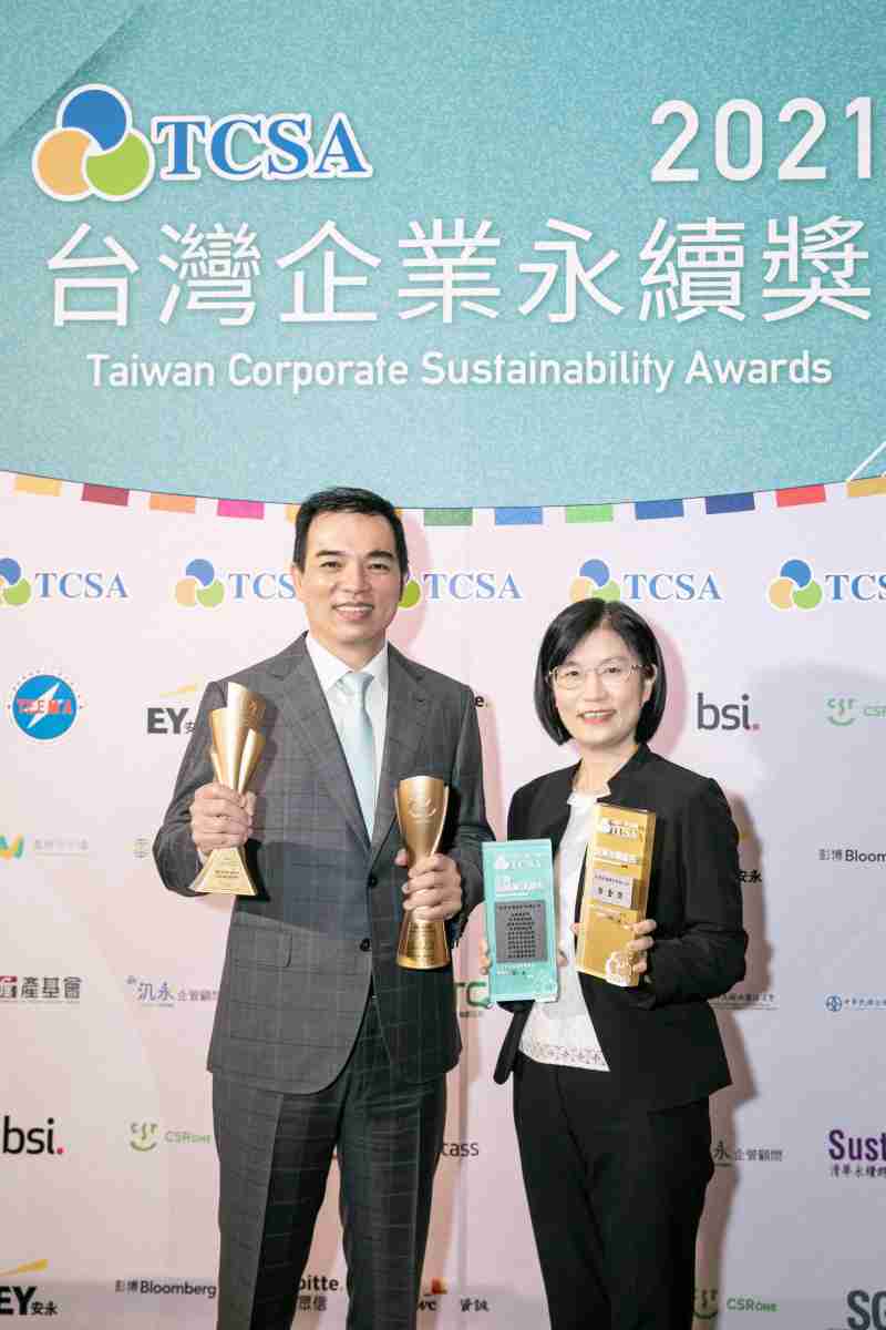 达在台湾永续奖所评比环境、、、社会、、、、治理等各面向的永续绩效均获高度肯定 (左:z6尊龙光电总经理暨营运长柯富仁,,右:z6尊龙光电永续长古秀华)