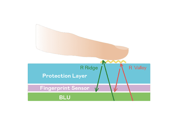 TFT 指纹扫描感测技术利用薄膜电晶体 (TFT) 当作光感测元件,,,藉由非晶硅 (a-Si) 与低温多晶硅(LTPS)既有光电转换特性对不同波段光源进行吸收,,使感测 IC 读取阵列感测元件的光漏电差异,,,,转换成数位灰阶影像。。